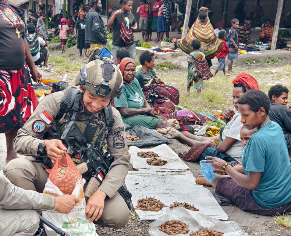 Di tengah suasana itu, sejumlah personel Operasi Damai Cartenz 2026 hadir dan berbaur dengan masyarakat. Mereka tidak datang dalam situasi formal, melainkan ikut berbelanja di lapak-lapak milik warga, menyapa, serta berbincang ringan dengan para pedagang.